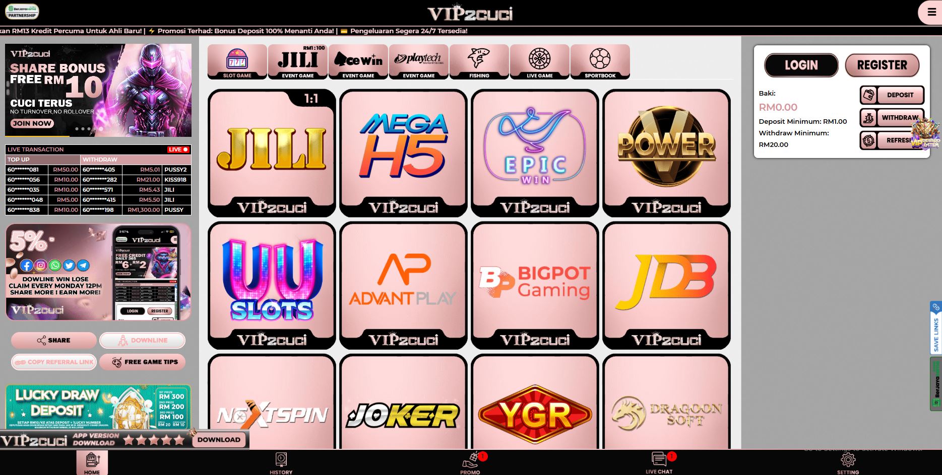 New members are welcomed with RM10 free credit, no deposit required. Use your bonus to try out hot slot games like Gates of Olympus, Mega888, and 918Kiss – or enjoy real-time table games with live dealers from around Asia. VIP2CUCI also runs daily promotions, unlimited rebate offers, and jackpot giveaways for loyal players.