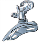 Переключатель с верхним хомутом. Конструктивно схож с FD-M511 Деор-группы. Основные отличния - немного другая рамка и стальное звено верхнего рычага. Подвод троса сверу или снизу.